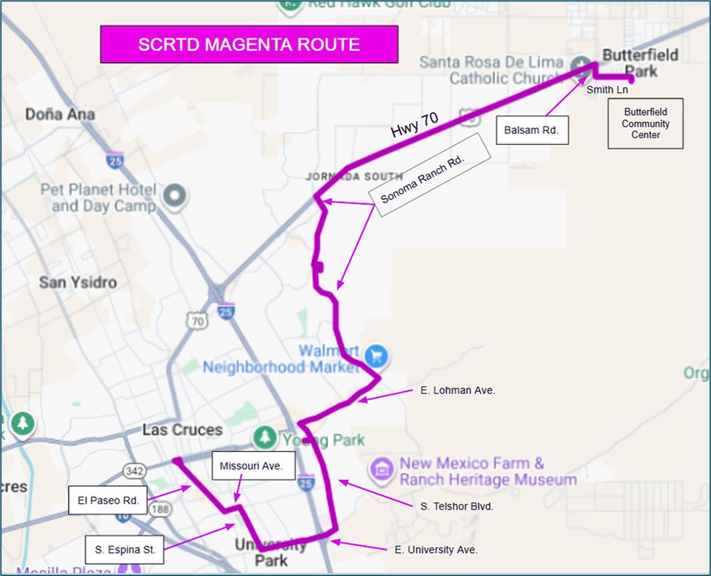 The South Central Regional Transit District (SCRTD) is expanding service with the launch of the new Magenta Route on Monday, December 15, 2025. This route will provide direct transportation between the Mesilla Valley Intermodal Transit Terminal (MVITT) in downtown Las Cruces and the Butterfield Community Center, offering a new mobility option for residents in rural Doña Ana County.